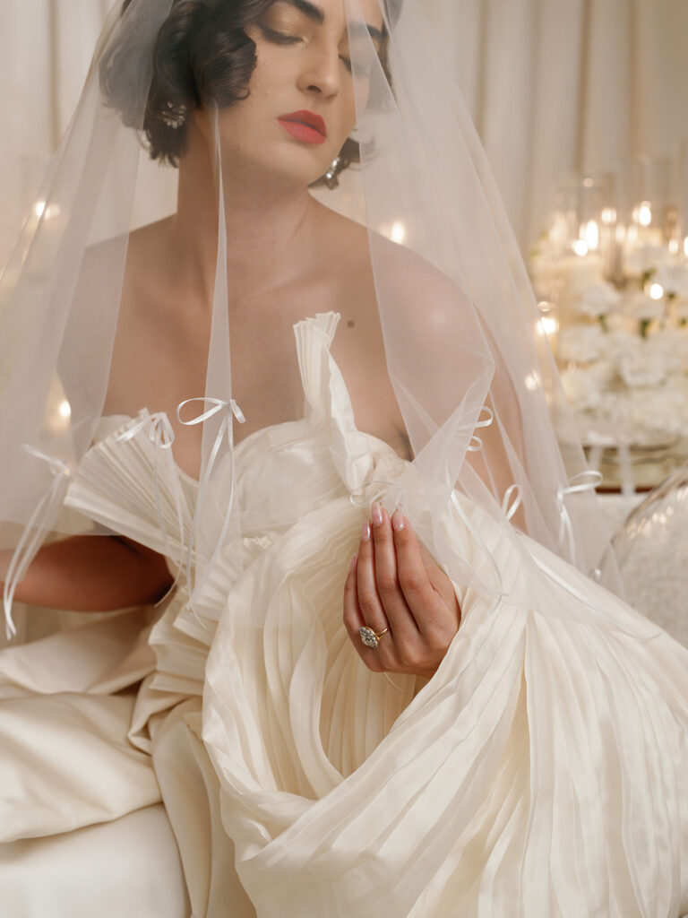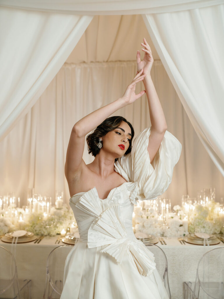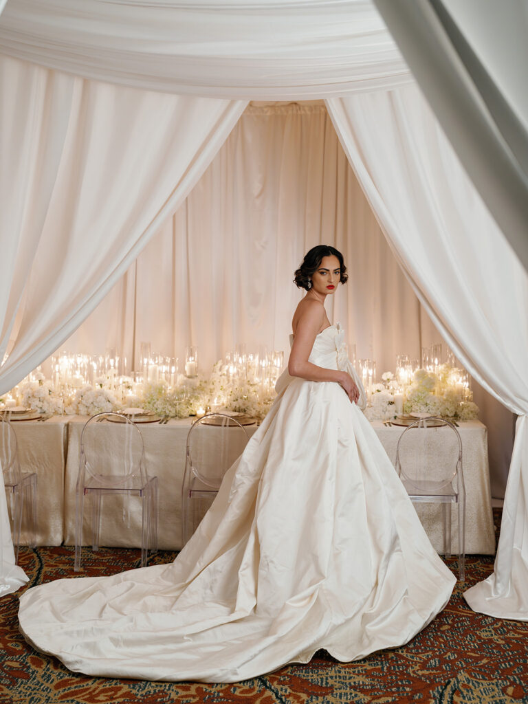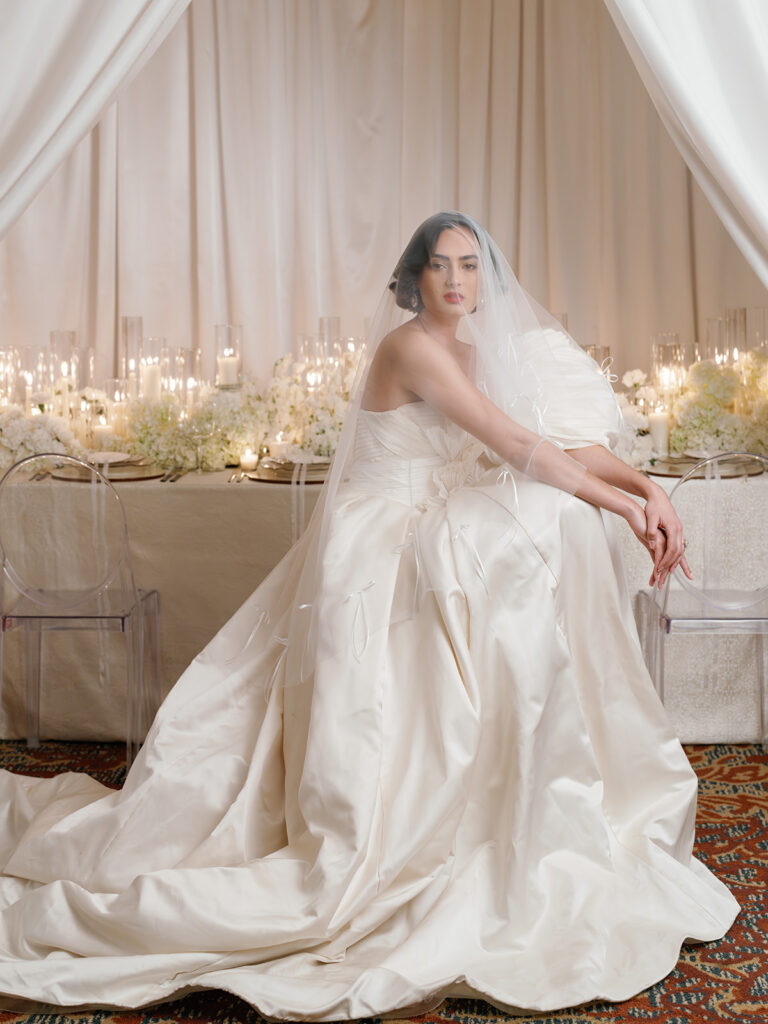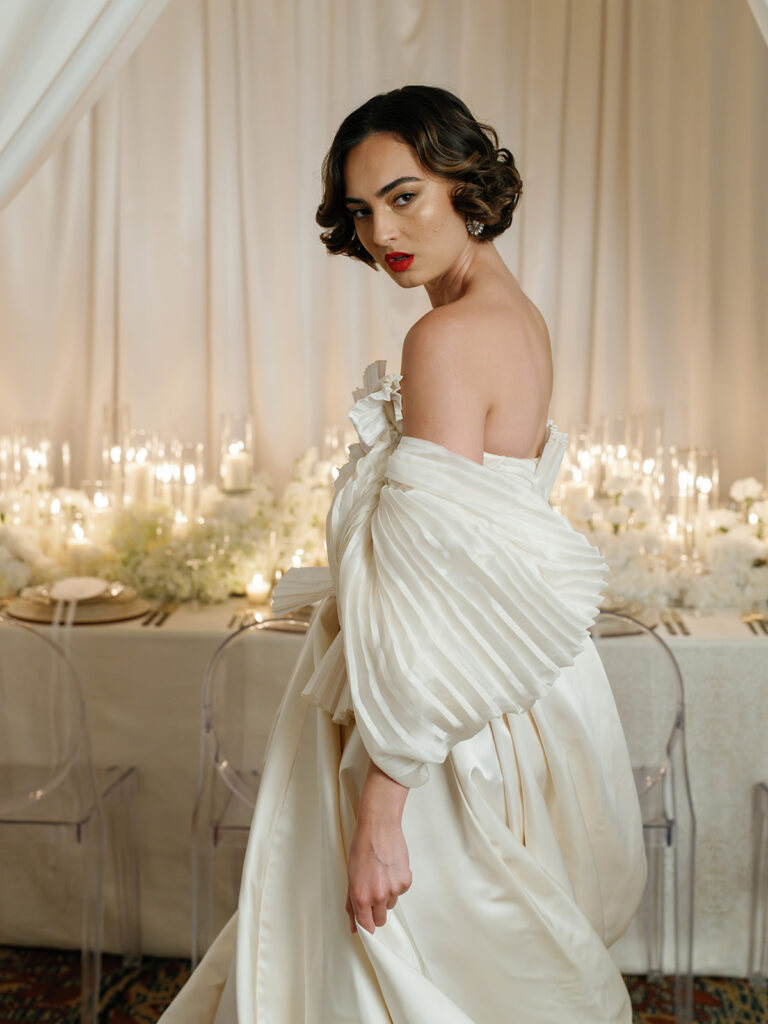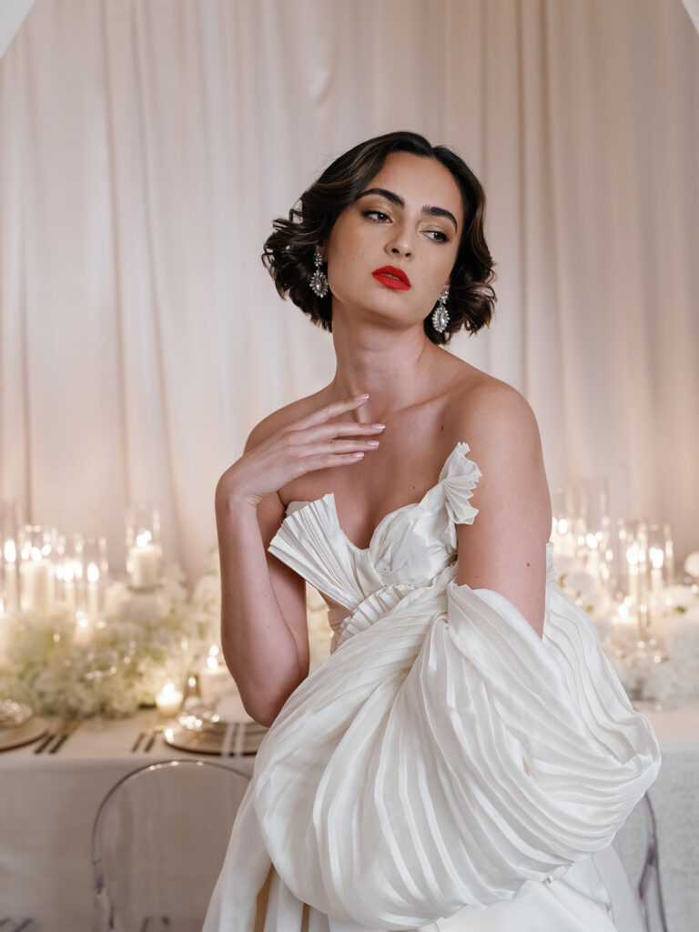 We had the privilege to produce and style an educational photography session alongside one of our favorite photographers, David Abel. Drawing inspiration from couture gown designer Karen Sabag, we pulled in details to the tabletop that glimmered to complement the candlelight of our session. Karen's gowns provided the drama, while the lighting and the floral design displayed a full spectrum of glamour for this gorgeous shoot.