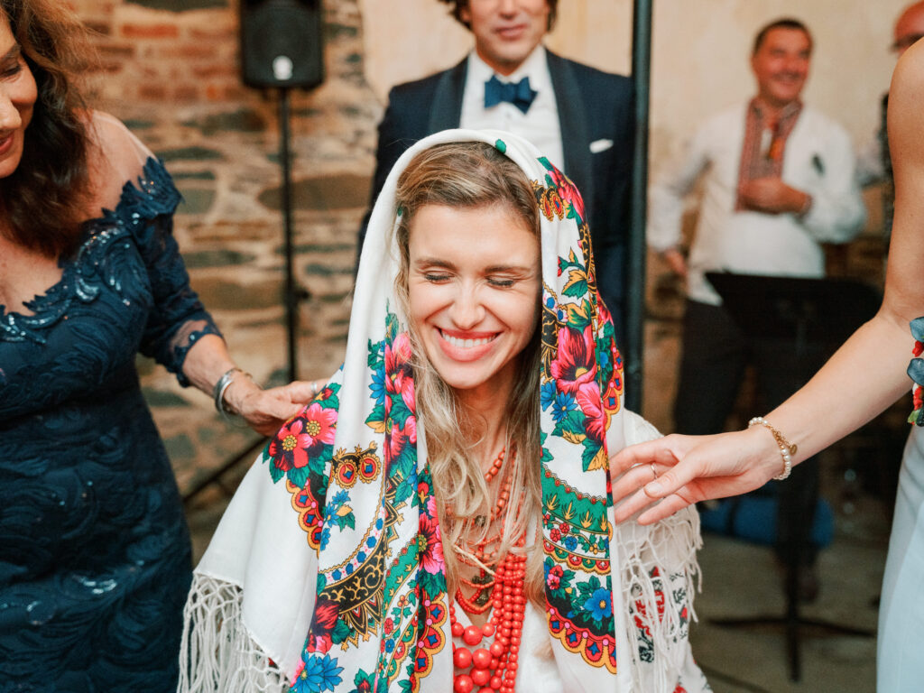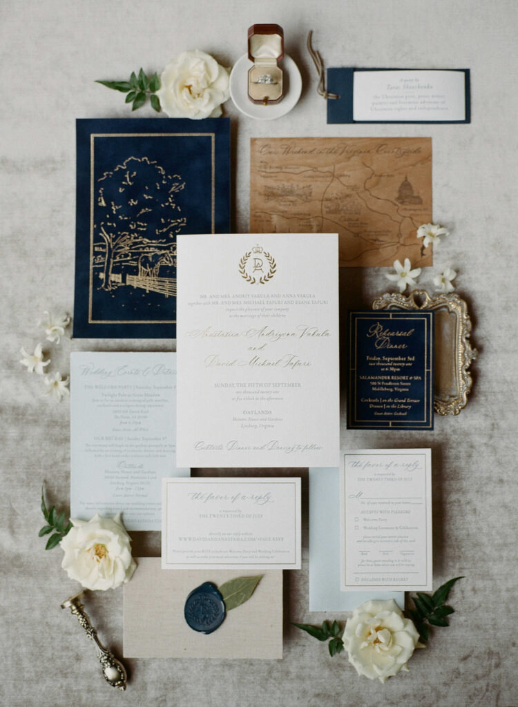 D & A's wedding day was a lovely mix of bespoke details, artfully blending their equestrian lifestyle and highlighting Anastasiia's Ukrainian culture. A custom wedding invitation suite set the tone for the weekend's events - featuring a hand-drawn equestrian illustration in gold foil on deep blue velvet for its backing, an Italian linen book cloth band (a nod to D's profession) pressed with a custom monogram & wax seal, a map of hunt country Virginia on cherry wood paper and a special keepsake quote from A's favorite Ukrainian poet.