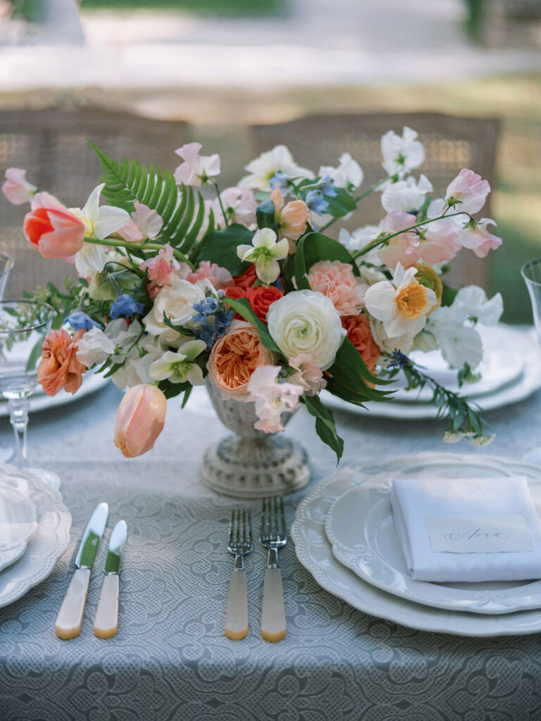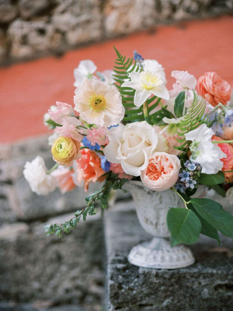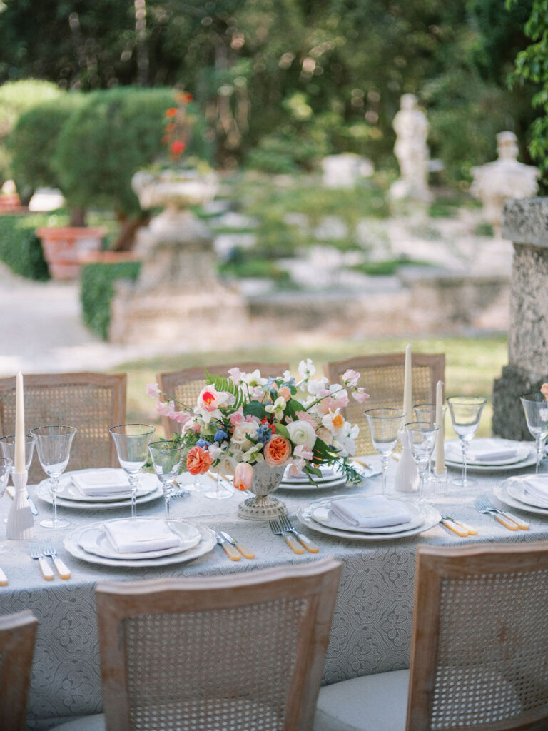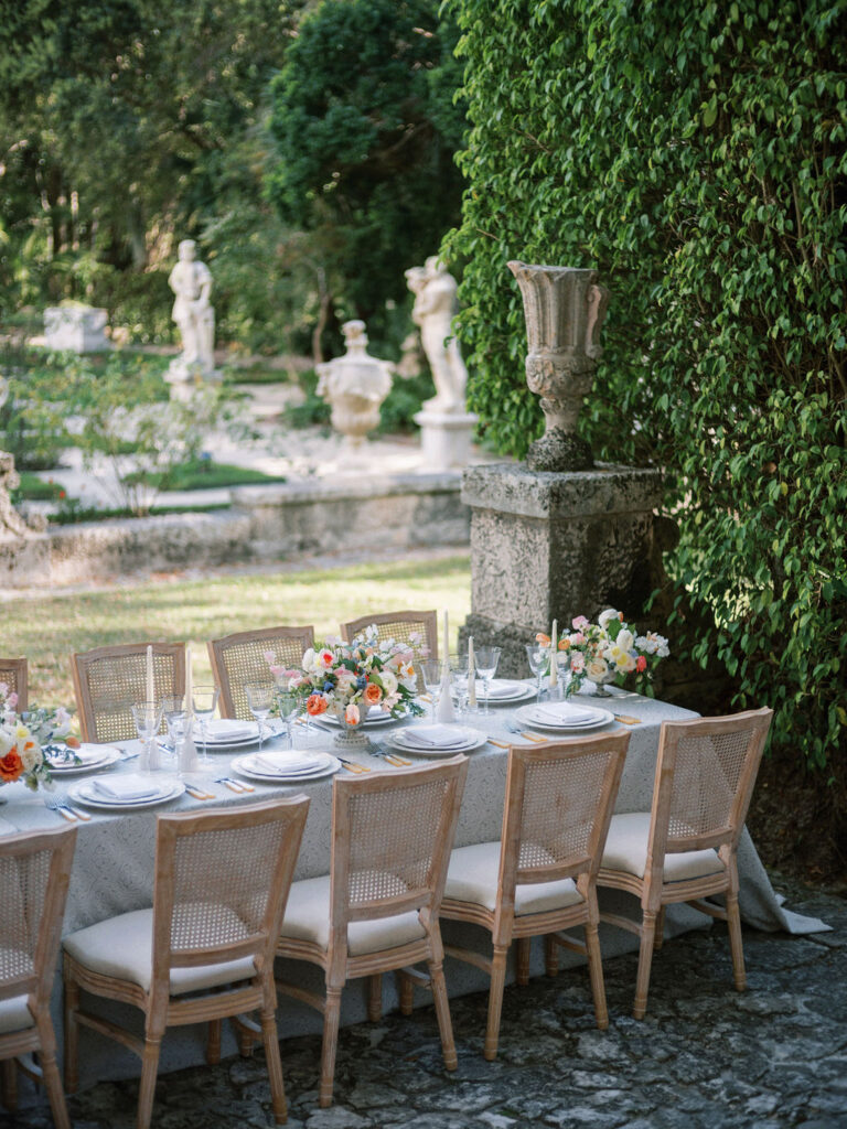 Italian Reverie Imbued with inspiration born from Vizcaya Museum and Gardens' 18th-century Mediterranean-style Italian architecture, our wedding inspiration is as formal as the gardens in which it takes place and as steeped in romance. Calling to mind the grand villas of the Riviera and fountains of Roma, our tablescape finds its place in the Fountain Garden, surrounded by statues and the worn façade of its stone walls. Beautifully captured on film by Ariel Noboa, this shoot was also featured in Style Me Pretty.